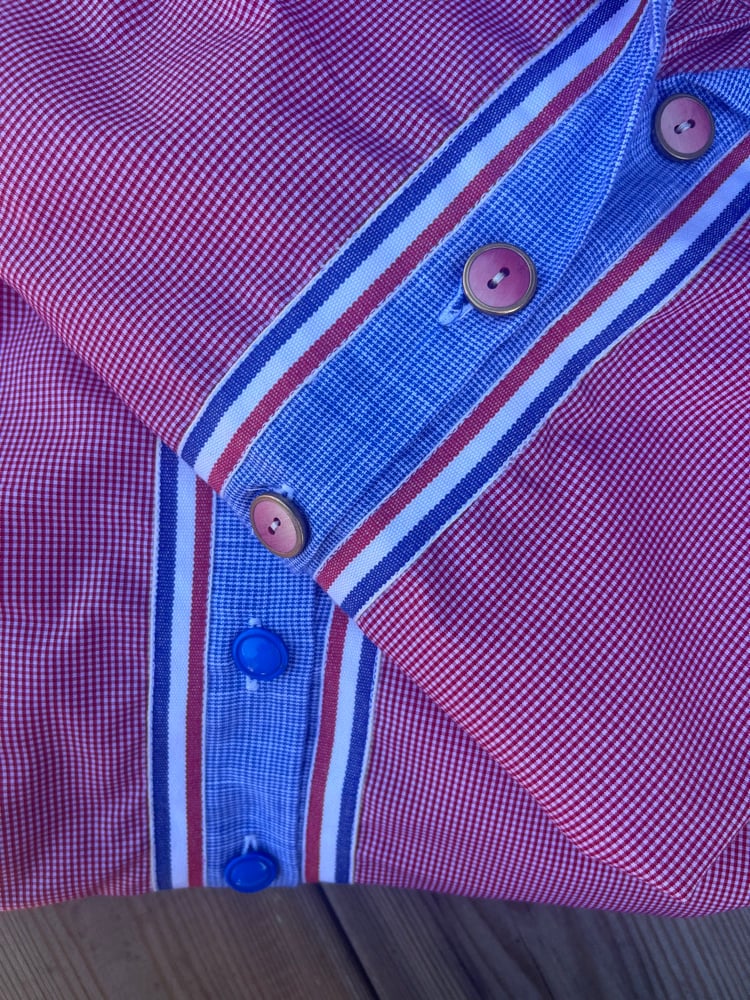 pied de poule rouge et blanc biais rouge et bleu boutons bleu